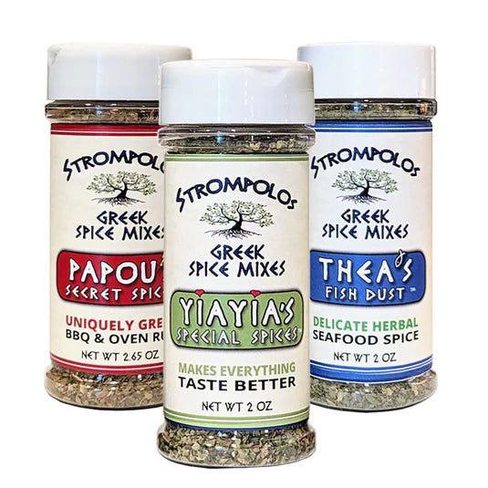 Choose any 6 spices from our signature collection—Yia Yia's Special Spices, Papou's Secret Spices, and Thea's Fish Dust. Add your selection in the notes at checkout and bring the flavors of Greece to your kitchen!